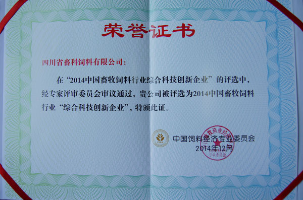 ——畜科榮獲2014年中國畜牧飼料行業(yè)“綜合科技創(chuàng)新企業(yè)”